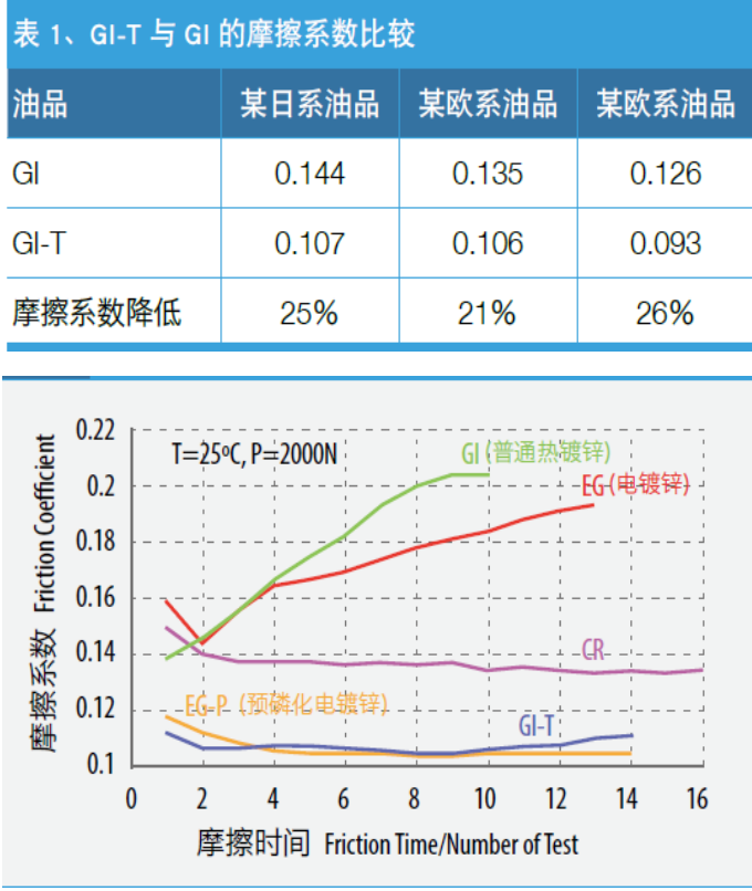 熱鍍鋅鋼板通過T處理可以降低表面的摩擦系數,穩定摩擦系數,從而減少汽車廠的模具清潔次數。(下列性能對比以GI-T為例)