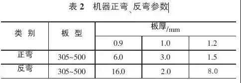 彎弧板機器正彎、反彎參數(shù),見表2。